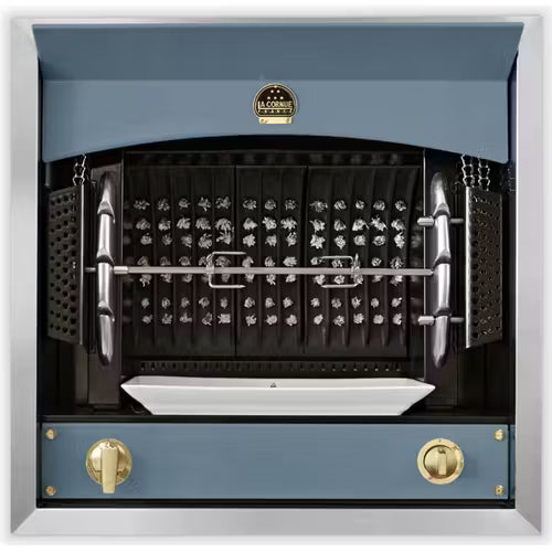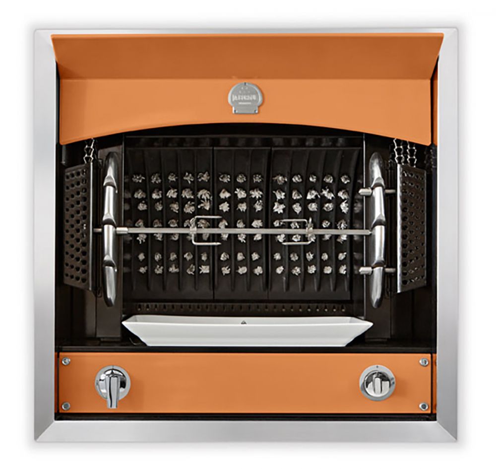 The Flamberge Rôtisserie is a premium wall-mounted gas rotisserie crafted for home use. Its solid cast iron concave rea wall distributes heat evenly from a powerful burner beneath three motorized spits, ensuring consistent, radiant cooking. Synthetic wicks draw heat through the vaulted back, delivering gentle, uniform warmth as foods slowly rotate. Included are two straight metal spits, a fish basket, and a porcelain drip tray, providing versatile options for roasting. This design balances expert heat control with ease of use for perfectly cooked meals every time.