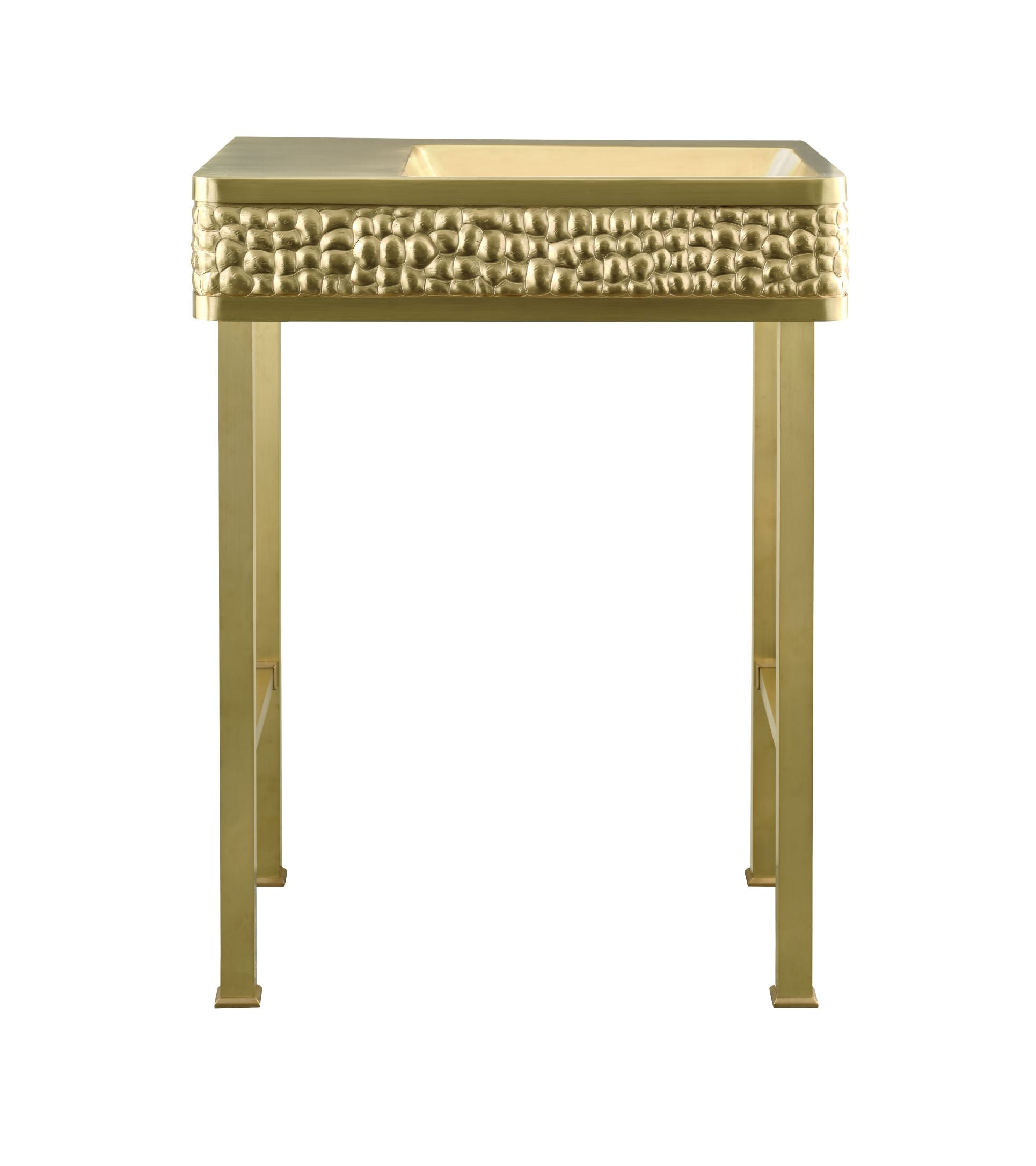 The Tortuga Vanity merges sophisticated design with practical craftsmanship. Handcrafted from satin brass, this statement piece features a distinctive tortoise shell-inspired texture paired with polished metal surfaces, creating visual depth and timeless elegance. Measuring 28"L x 20"W x 36"H, it provides functional beauty for any bathroom. Choose from 12 custom finishes and made-to-order sizing to match your aesthetic. The durable satin brass finish resists patina, ensuring your vanity maintains its lustrous appearance for years with minimal maintenance. A refined addition that transforms your space into a serene, curated sanctuary.
